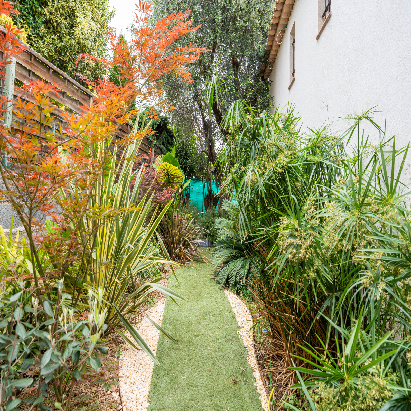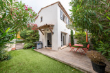 Jardin attenant avec terrasse et chalet de jardin, possibilité de garer deux voitures, climatisation réversible, tout-à-l'égout, isolation classe B, villa clé en main, aucun travaux à prévoir.