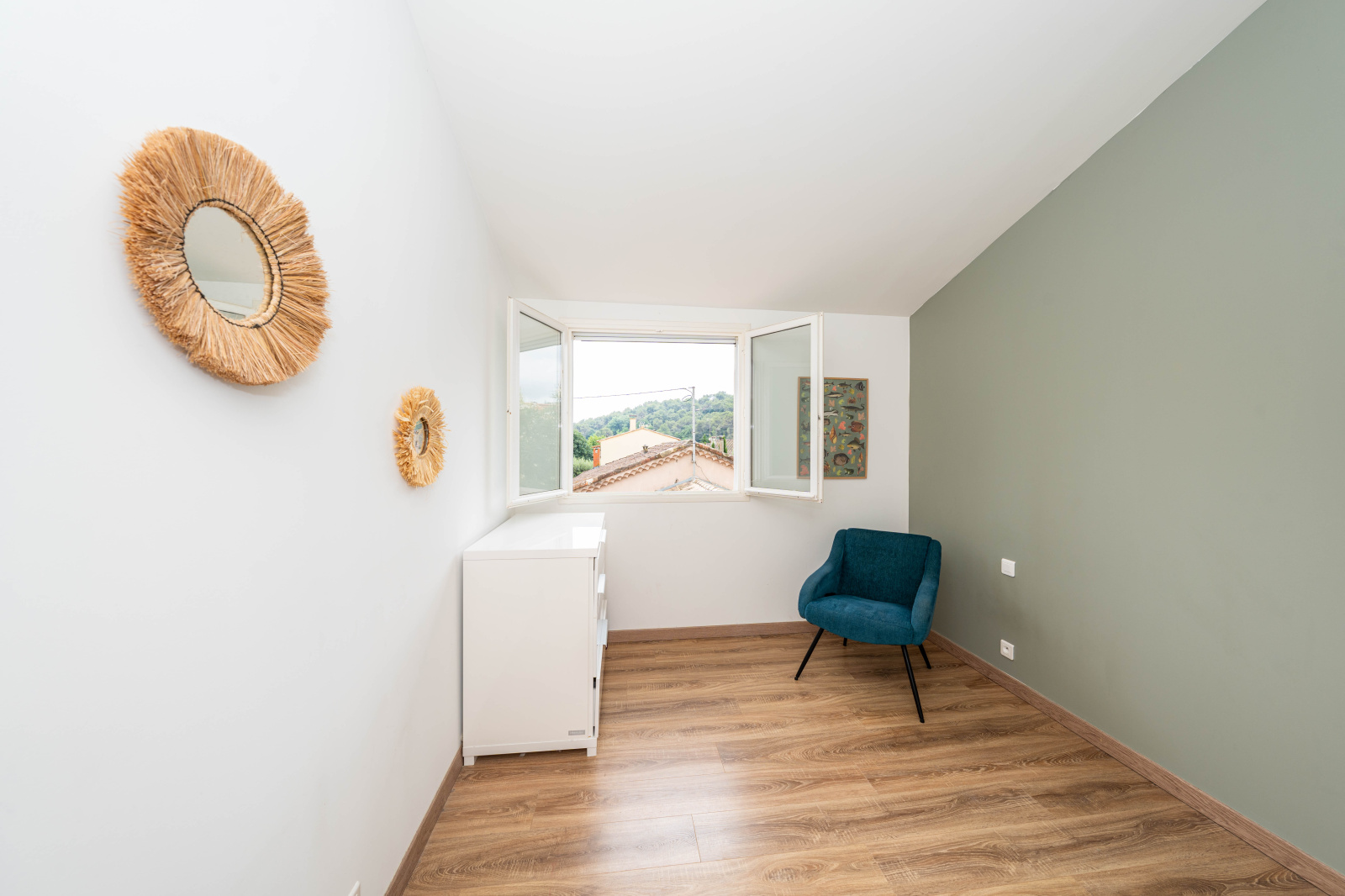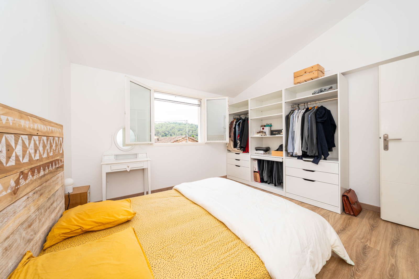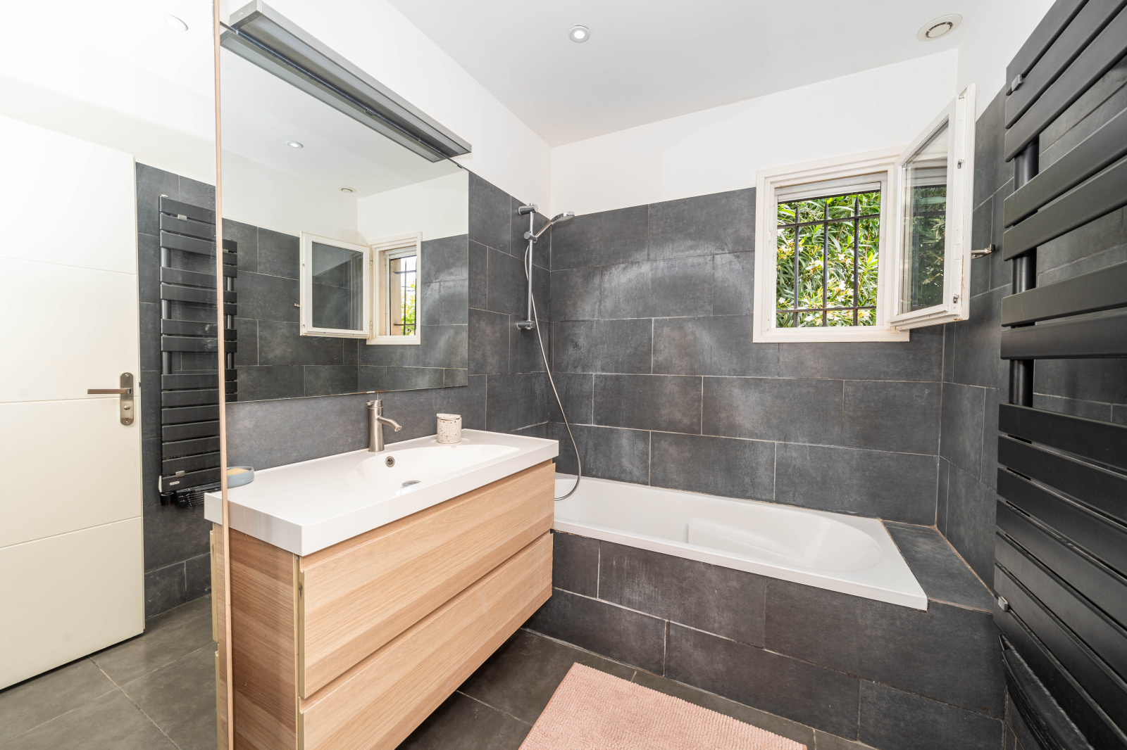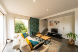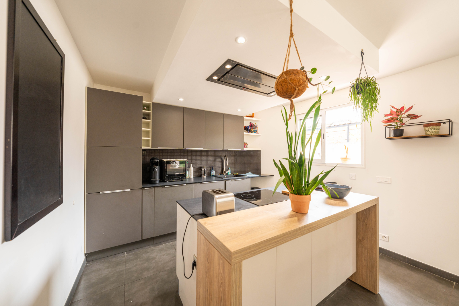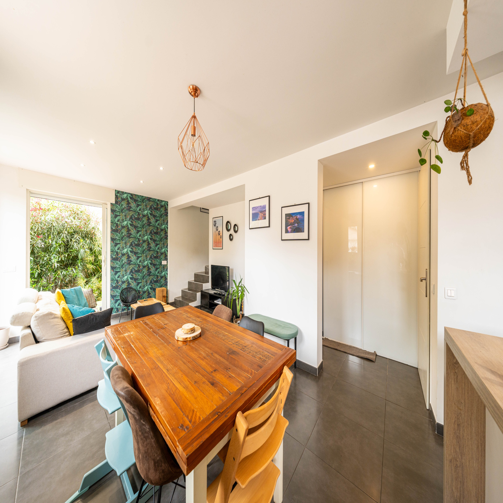 - Au rez-de-chaussée, on retrouve une entrée avec placard, un séjour salle à manger ave cuisine ouverte équipée et un toilette invité. Toutes les pièces ont accès au jardin et à la terrasse.