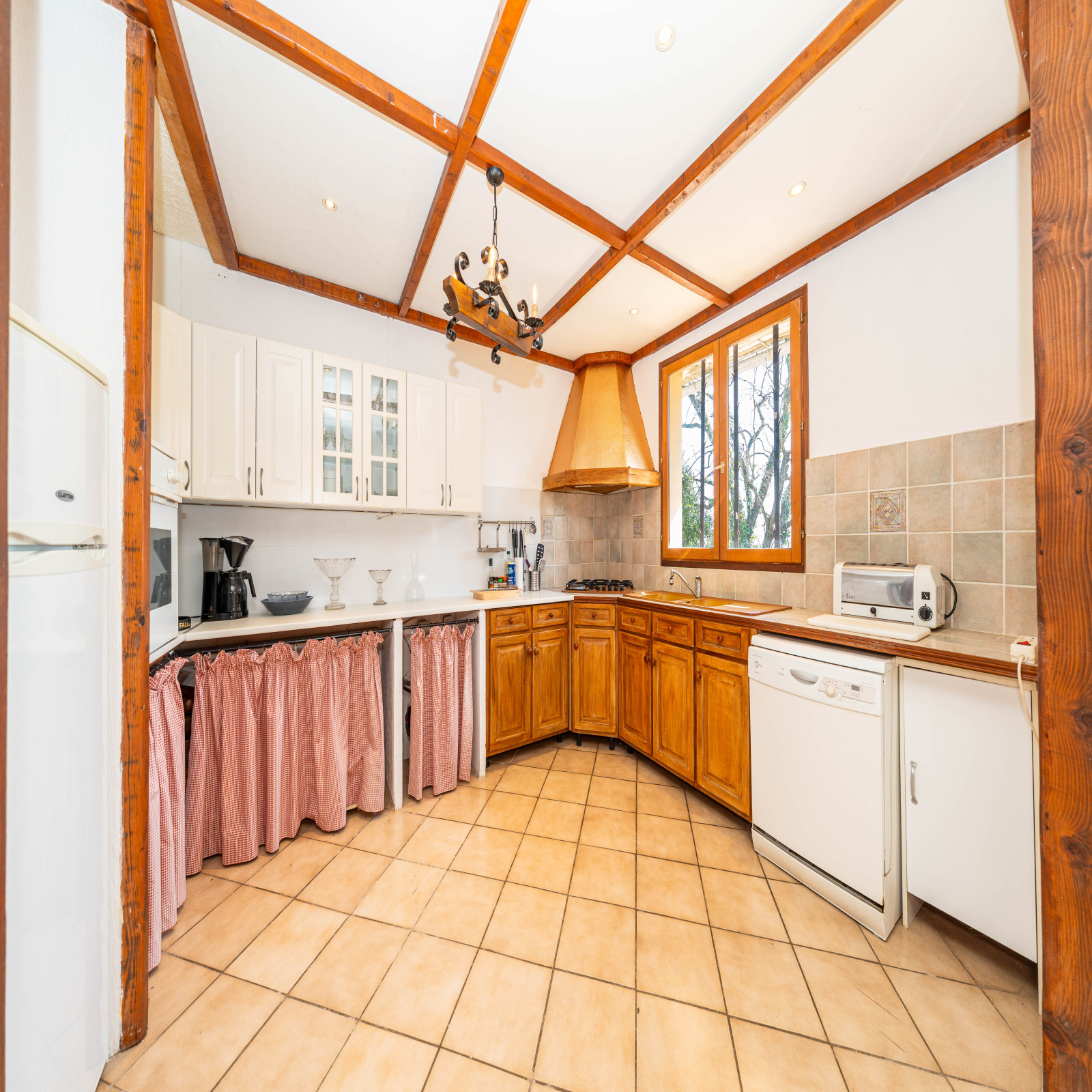 Un escalier intérieur mène au rez-de-jardin, où un appartement indépendant d'une superficie de 126 m² constitue un cadre de vie idéal pour accueillir famille et amis. Il comprend un séjour avec cuisine ouverte, trois chambres, dont une avec salle de bain et WC privatifs, ainsi qu’une salle de douche supplémentaire, un WC séparé et une buanderie. Une belle terrasse ensoleillée offre une vue dégagée sur la piscine, créant un lieu propice à la détente et aux moments de partage.