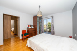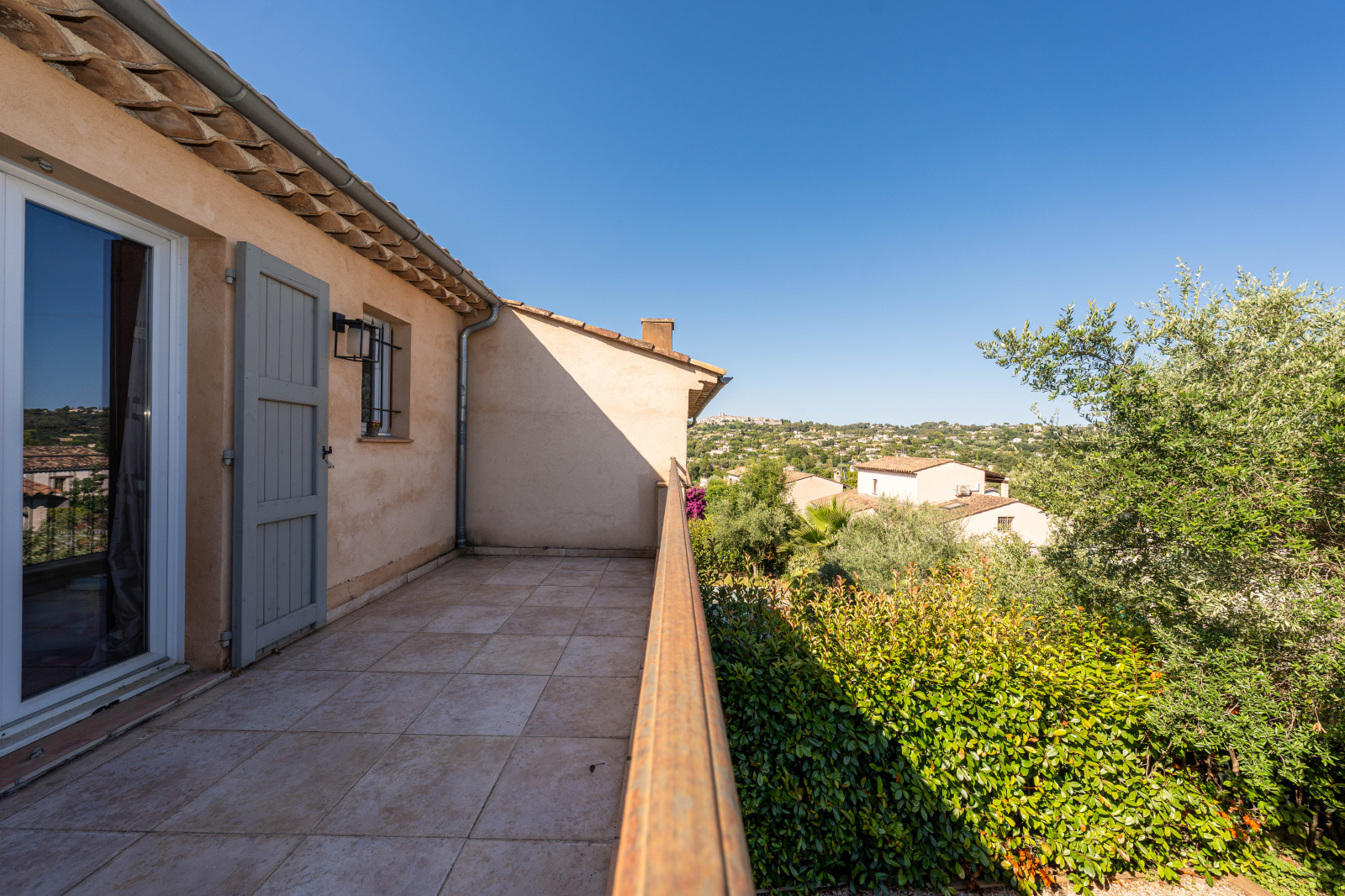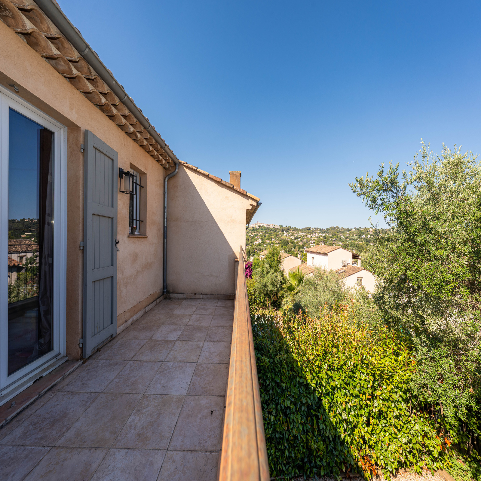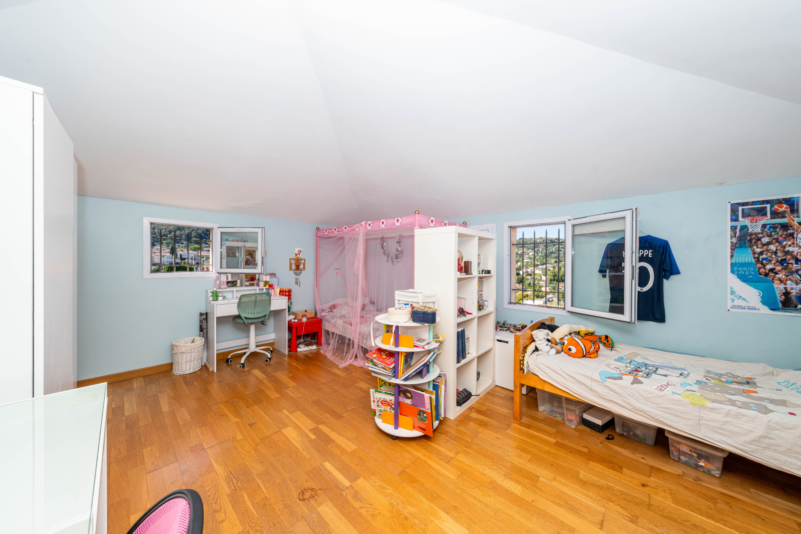 Au dernier niveau, une grande chambre mansardée de 20 m² avec salle d’eau bénéficie d’une vue sur le village de Saint-Paul-de-Vence.