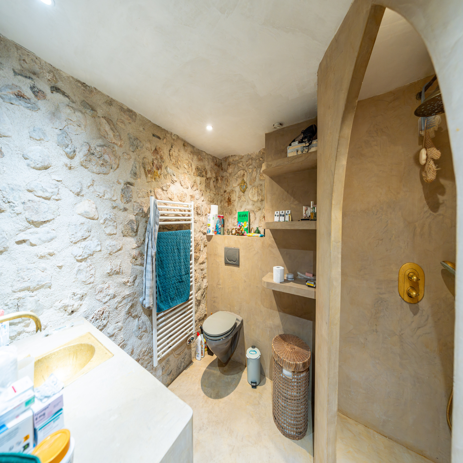 A l'étage, on retrouve l'espace nuit avec chambre, placards, salle de douche en béton ciré et toilette.