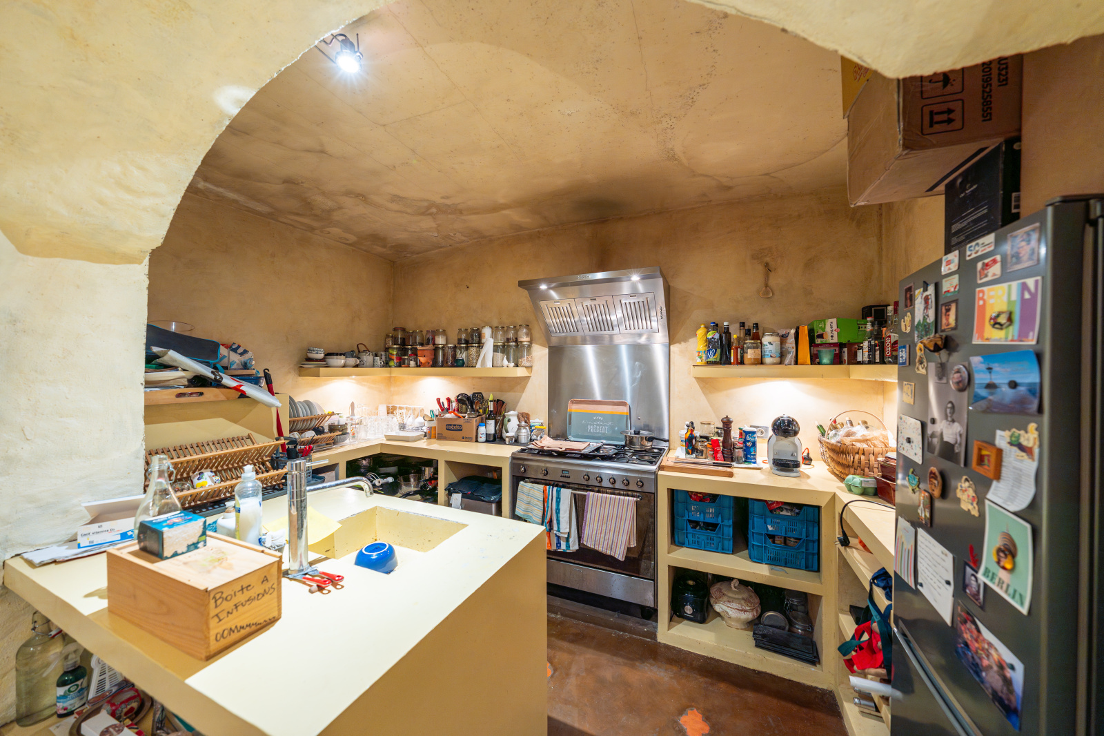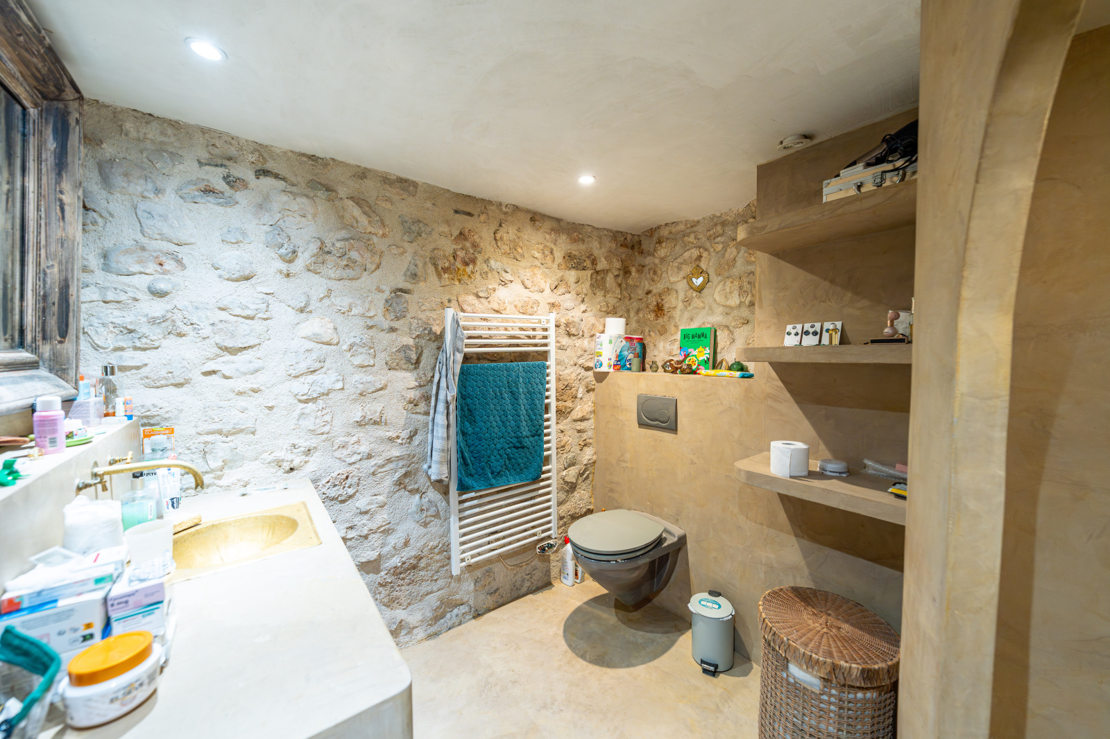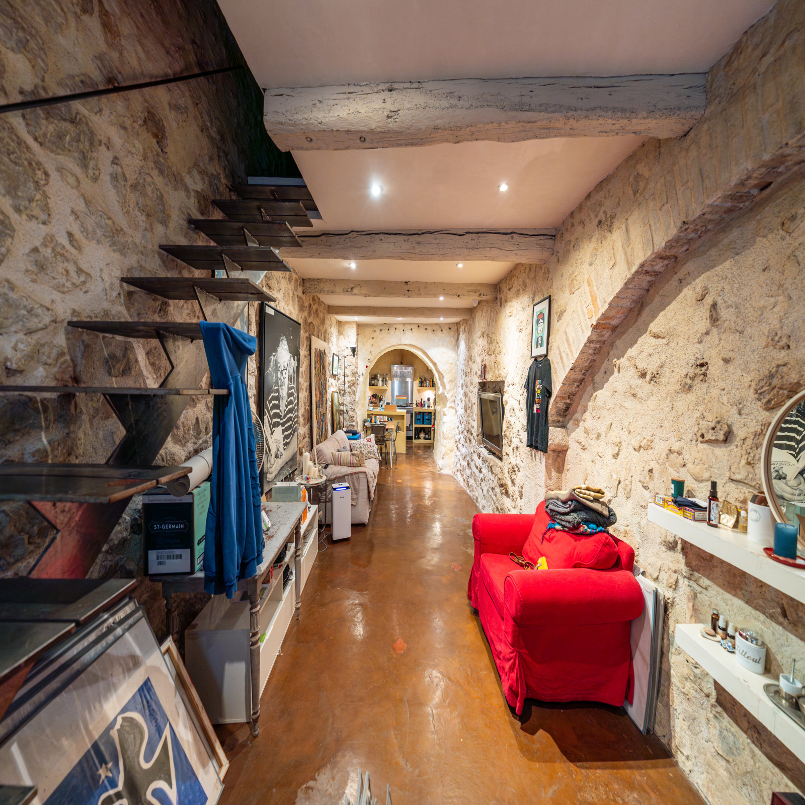 Il se compose au rez-de-rue, d'un séjour salle à manger avec cuisine ouverte de 33m2, les pierres apparentes, les murs voutés feront de cet espace un véritable cocon.