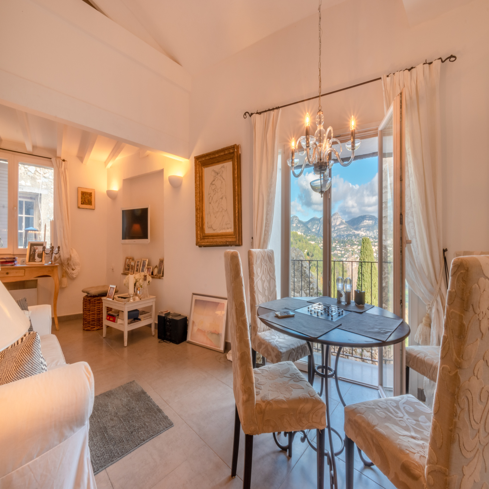 À l’étage, l’espace de vie bénéficie d’une superbe vue dégagée sur les montagnes. On y retrouve un séjour déplafonné lumineux ouvrant sur un balcon plein de charme, une cuisine ouverte équipée, une mezzanine, ainsi qu’une seconde salle de douche avec WC.