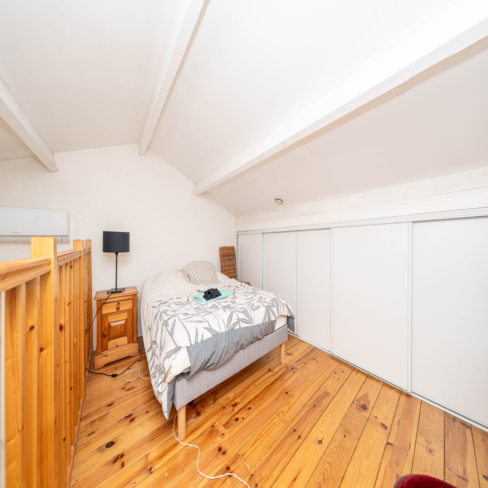 À l’étage, deux chambres, une salle de bain et un WC indépendant composent la partie nuit.