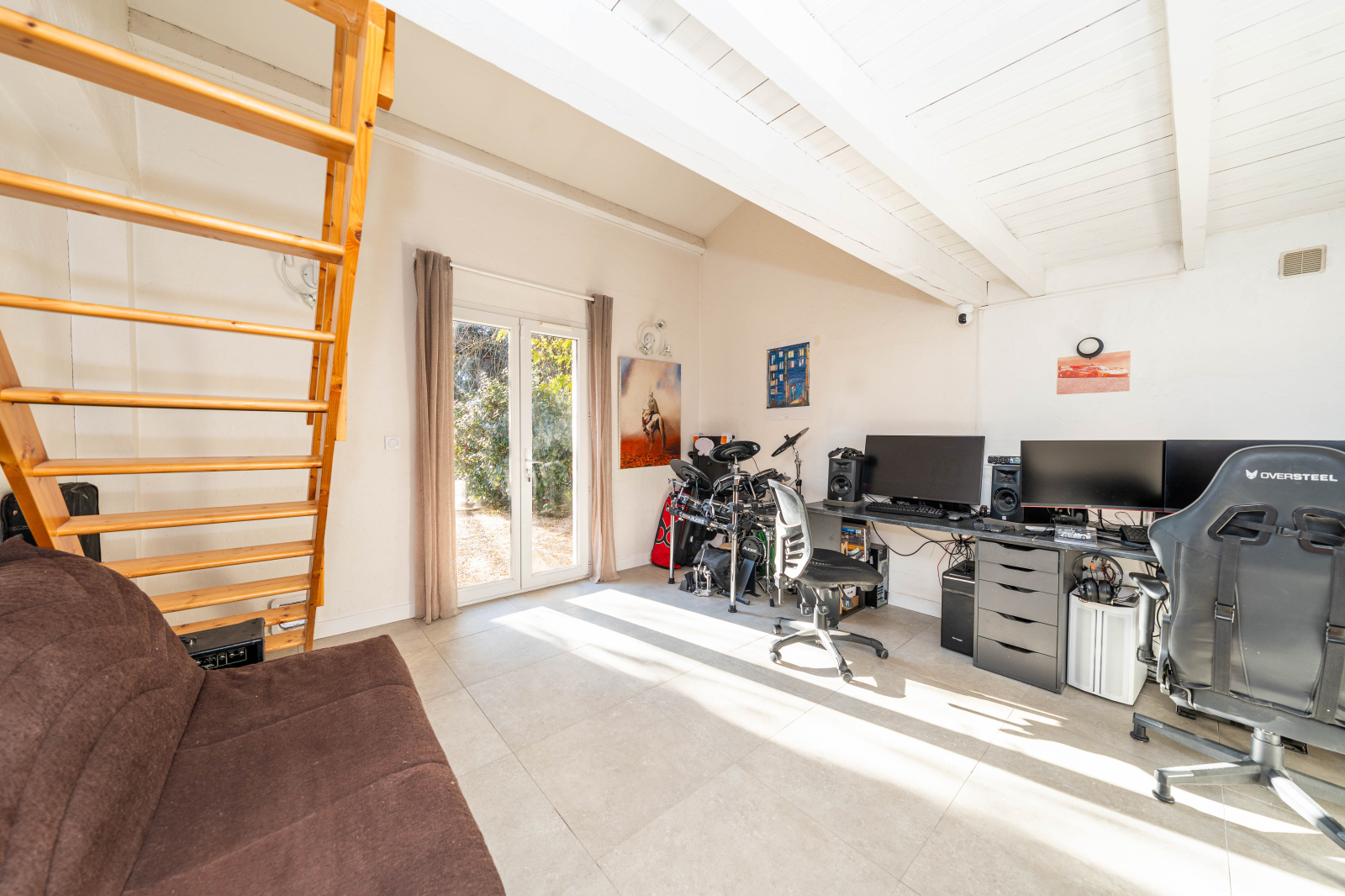 Ce niveau comprend également une grande chambre de plain-pied avec mezzanine, salle de douche et WC. Grâce à sa configuration et son accès, elle peut aisément devenir un studio indépendant. Un bureau ainsi qu’une buanderie complètent ce niveau.