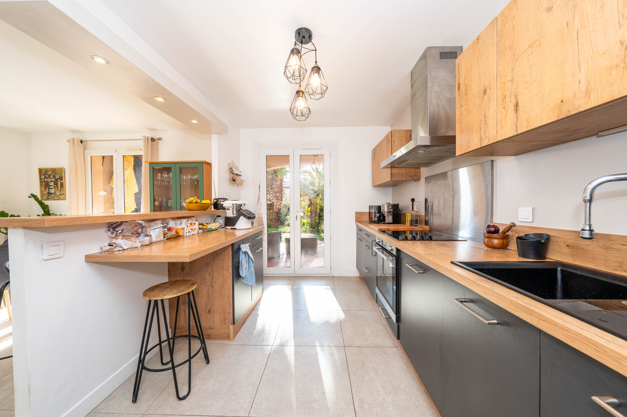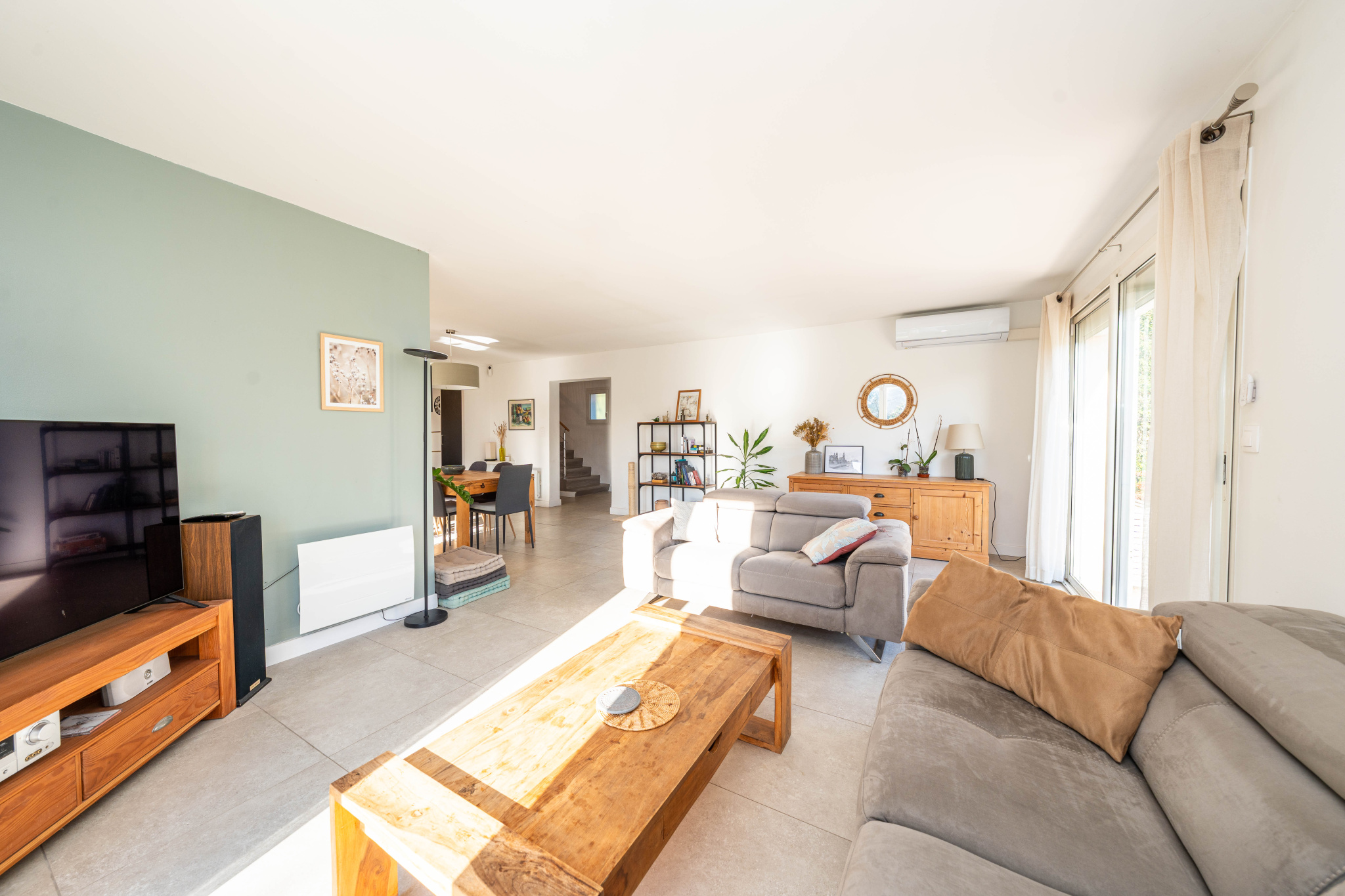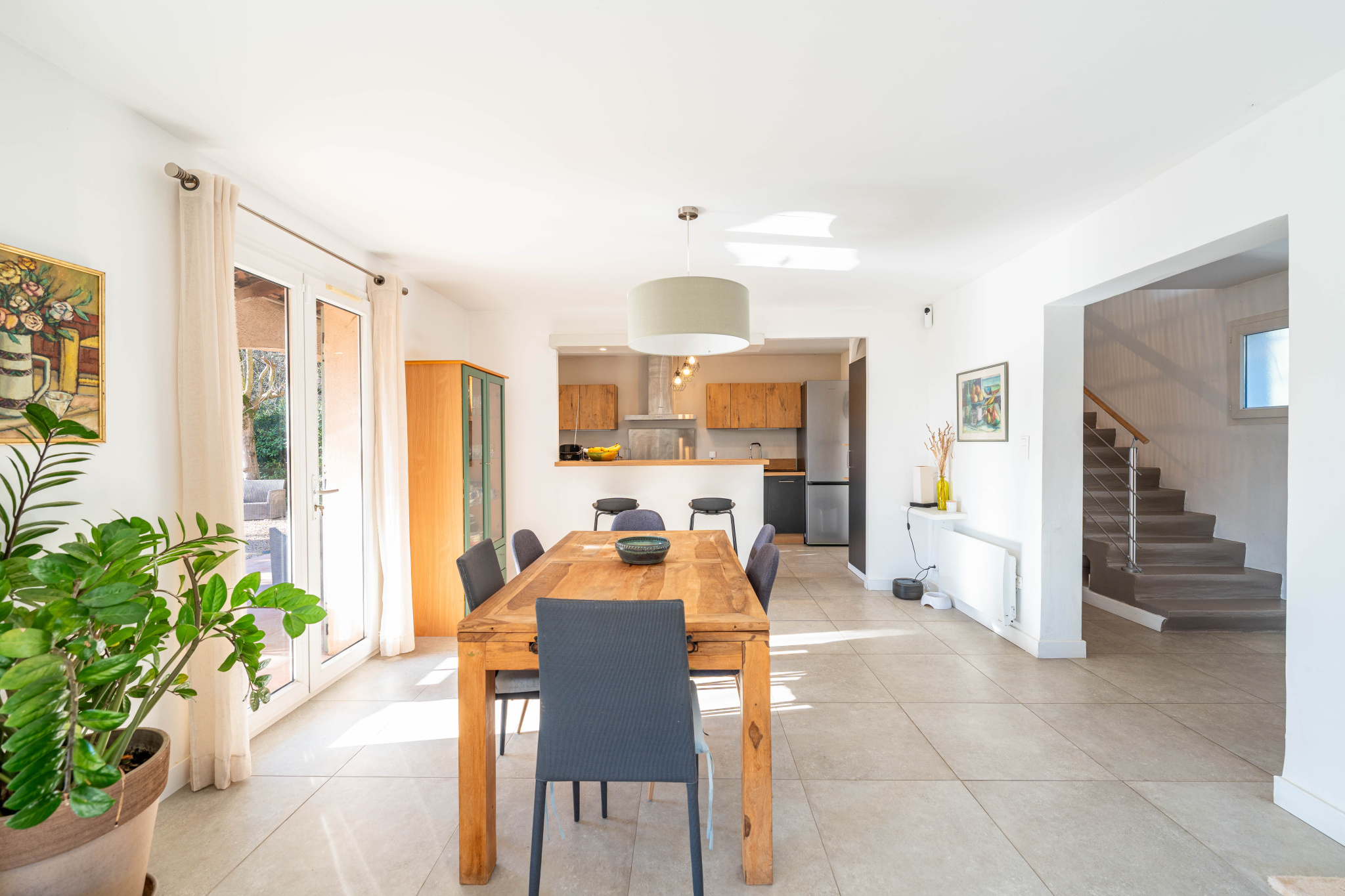 Au rez-de-chaussée, l’entrée mène à un beau séjour salle à manger de 48 m² avec cuisine ouverte équipée. Les pièces de vie s’ouvrent sur deux terrasses, l'une couverte côté cuisine, idéale pour les repas à l’ombre, et une seconde terrasse côté salon, permettant de profiter pleinement du jardin selon les moments de la journée et les saisons.