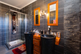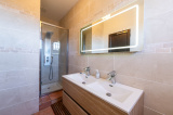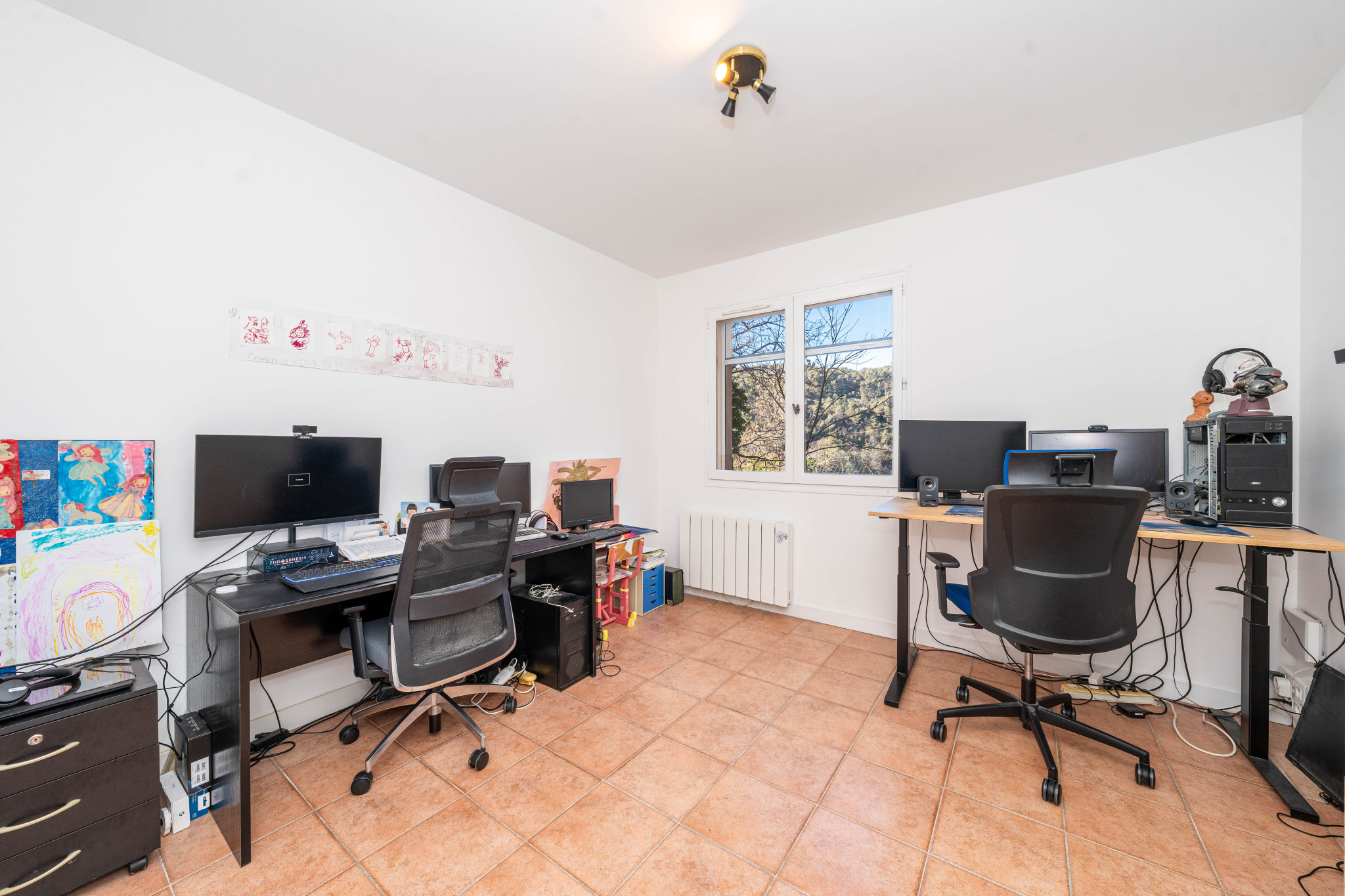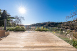 En rez-de-jardin, l’espace nuit se compose de trois chambres, dont deux en suite, ainsi que d’une buanderie, d’un dressing, d’une cave à vin et d’une pièce polyvalente, modulable selon les besoins de chacun (salle de sport, salle de cinéma, espace bien-être ou bureau). Ce niveau s’ouvre sur une vaste terrasse en bois dominant le village.