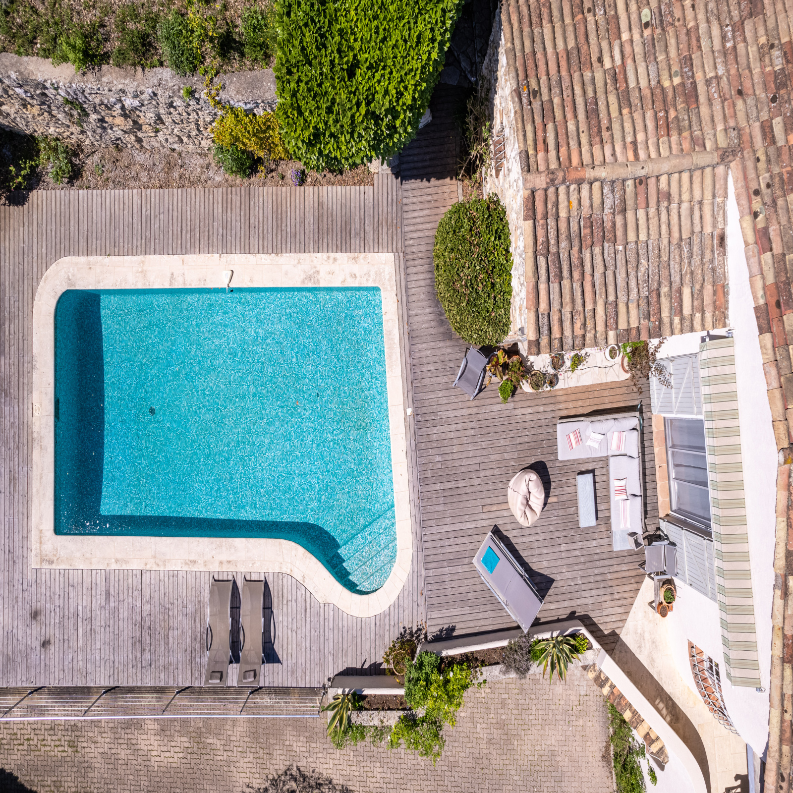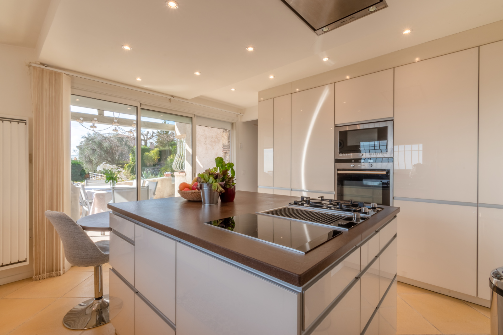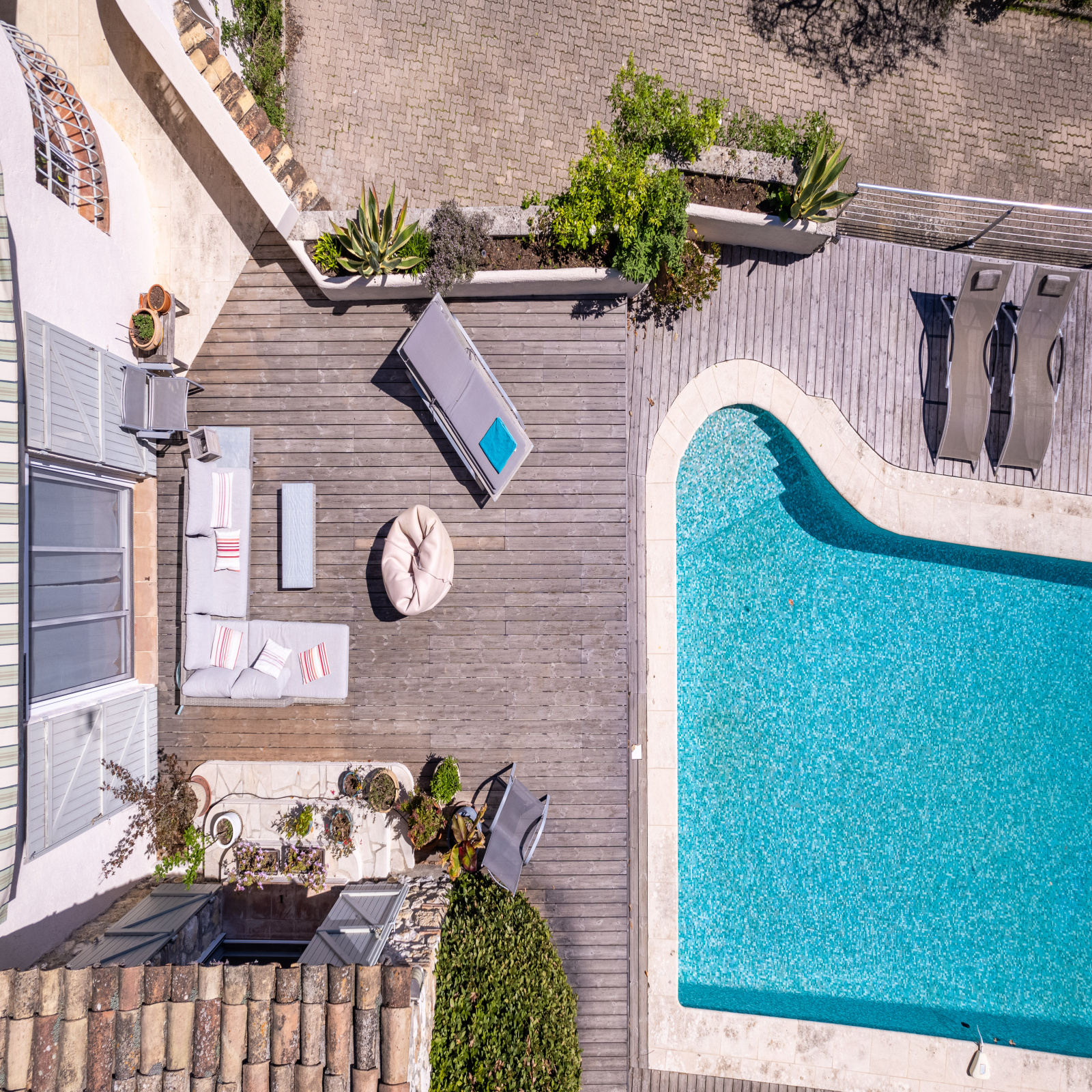 Le terrain de 1 500 m² est joliment complanté d’essences méditerranéennes. La piscine chauffée prolonge les plaisirs de la belle saison, elle est entourée d'une large terrasse en bois, qui permet de profiter pleinement des extérieurs en toute intimité. En hauteur, un toit-terrasse avec cuisine d’été offre un panorama unique et invite à la détente face à la mer.