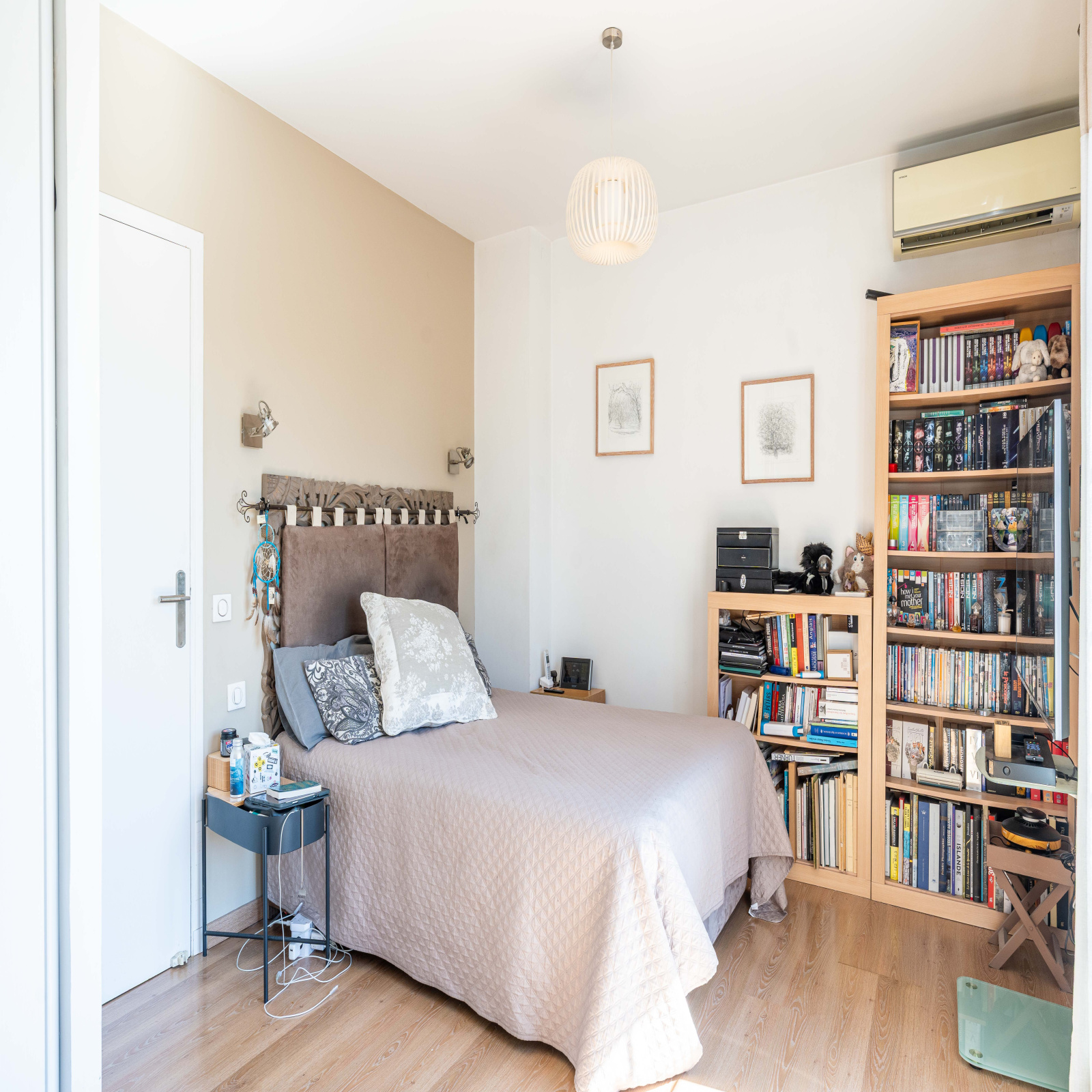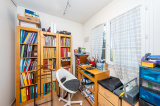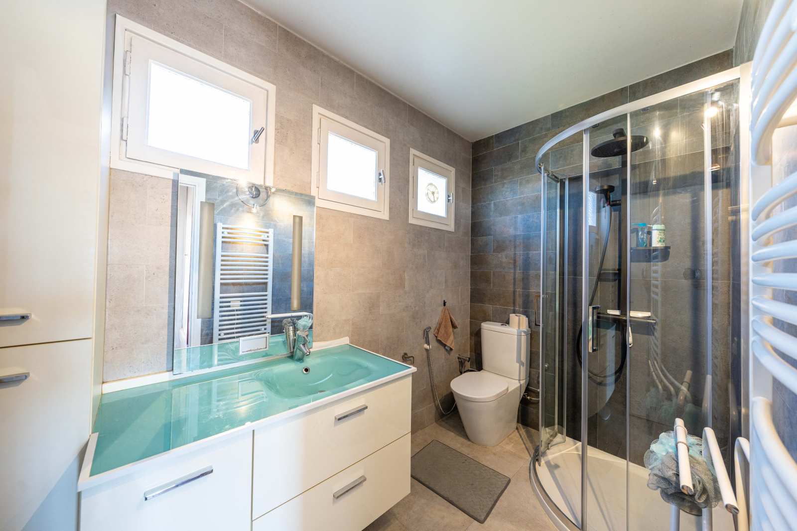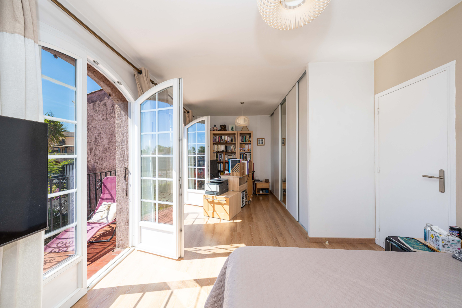 À l’étage, on retrouve une très grande chambre avec accès à une terrasse, une deuxième chambre, ainsi qu’une salle de douche avec WC. La grande chambre est issue de la réunion de deux chambres initiales ce qui permet selon les besoins de recréer facilement une troisième chambre et de transformer ainsi la maison en quatre pièces.