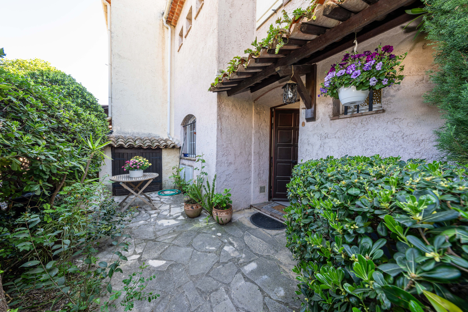 La maison s’ouvre sur un agréable jardin à l’entrée avec cabanon de rangement. Le rez-de-chaussée comprend une entrée, un séjour / salle à manger lumineux, une cuisine séparée ainsi qu’un WC indépendant. Le séjour ouvre sur un jardin joliment arboré exposé sud-est.